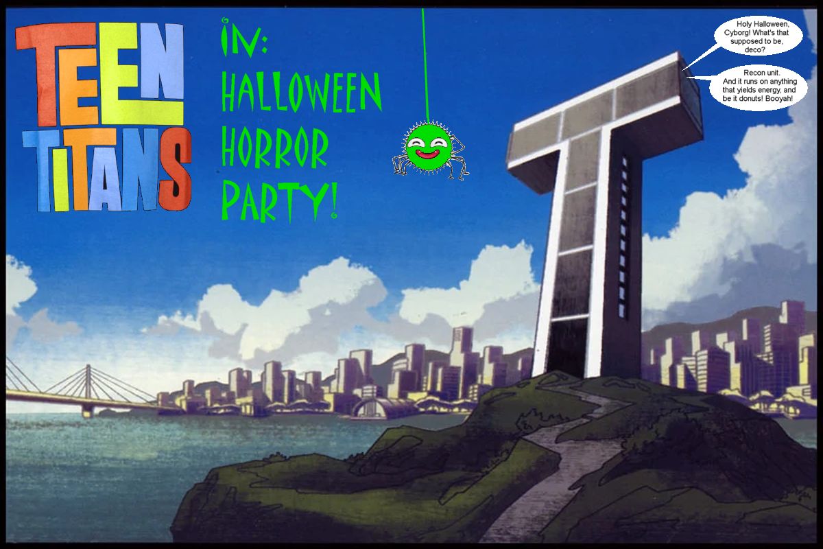 Cyborg was tinkering, as usual. Robin dropped in. (Literally - the Titan Tower does have doors, but nobody ever seems to use them.) "Holy Halloween, Cyborg! What's that supposed to be, deco?" "Recon unit. And it runs on anything that yields energy, and be it donuts. Booyah!" "Fine, but a) I'm far more inconspicuous in ninja mode, b) Gizmo is just curing all his broken bones so c) I say we take those spideroids as Halloween deco." And since Beast Boy just flew in (literally), Robin grounded him (literally) to decorate the Tower rooms for the night. "I'll go with Cyborg and demonstrate him my mad Ninja skillz, I think I left some bones of Gizmo unbroken. Don't expect me back before midnight. I want top-scary Halloween exhibits until then, you sloth!" "Yes, Big Boss," Beast Boy yawned and waved goodbye with his claw-toes.