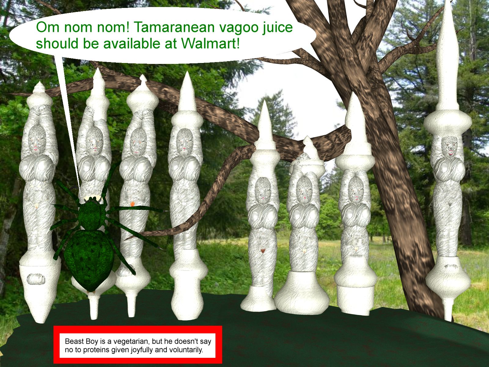 Beast Boy began to firmly cocoon the girls. When his work was done, they were completely encased in silk, except for their nether regions. After all, they were completely wet and Beast Boy had more sucking to do. "OM NOM NOM! Tamaranean vagoo juice should be available at Walmart!" he rejoiced when he sucked Blackfire dry. Vegetarians are always in danger of getting not enough high-quality proteins.