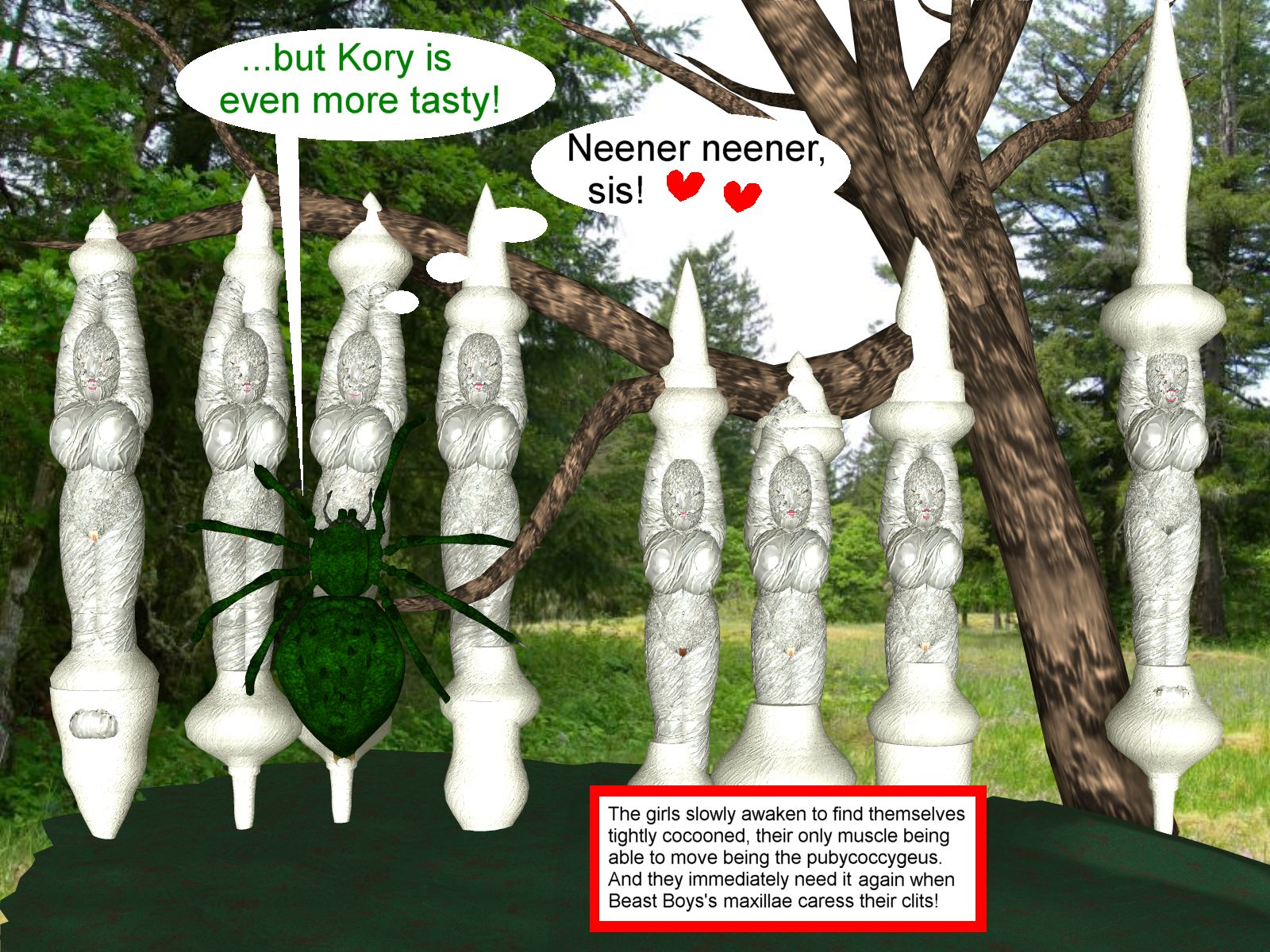 Well, that was all what she brought out, it ended in "M-ph!", as Beast Boy glued her mouth shut. And then a astonished but joyful "MMMH!", as Beast Boy did a thing a spider probably couldn't (but he is amazingly dexterous even with chelicerae) - he unpacked her big breasts and caressed them. Raven gave up resistance suspiciously easily, and the remaining girls unisono screamed: "We iterate: helpless and abominable!", wriggling in anticipation of their presumably very pleasurable fate.