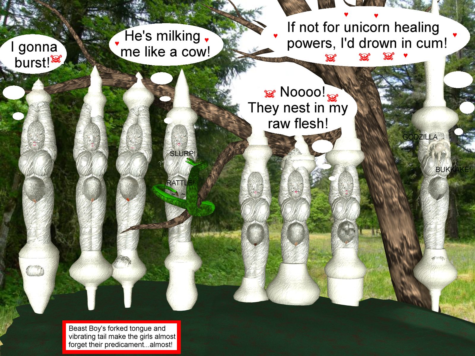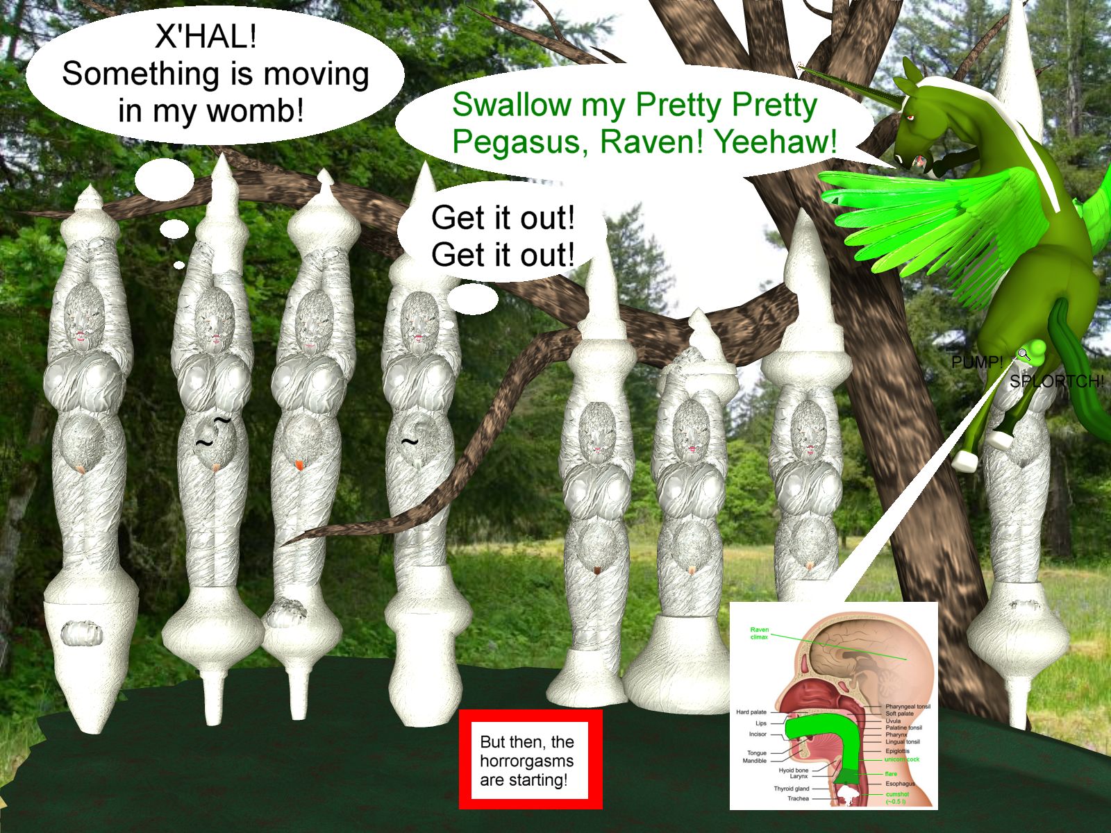Beast Boy, in the meantime, thought that now he had the right for some own fun and turned into a flying unicorn. "Swallow my Pretty Pretty Pegasus, Raven! Yeehaw!" he cried out and removed Raven's gag. She opened her mouth to...whatever, probably some azarathmetrionzinthos as usual, but it was immediately filled with horsecock. (More scientific factoid: If you ever saw a stallion, you might have wondered about the funny form of his glans penis. Notwithstanding the fact that the stallion will likewise wonder about YOUR weenie, the reason is simple: nature shaped it such that a human, resp. half-demon, girl can't spit it out. Wonders of Evolution.) Deeper and deeper it went. Raven's gag reflexes took it into a loving embrace. And then Beast Boy's cumshot filled her lungs. Good that the unicorn has amazing healing powers or even her half-demon nature wouldn't have saved her from drowning in cum.