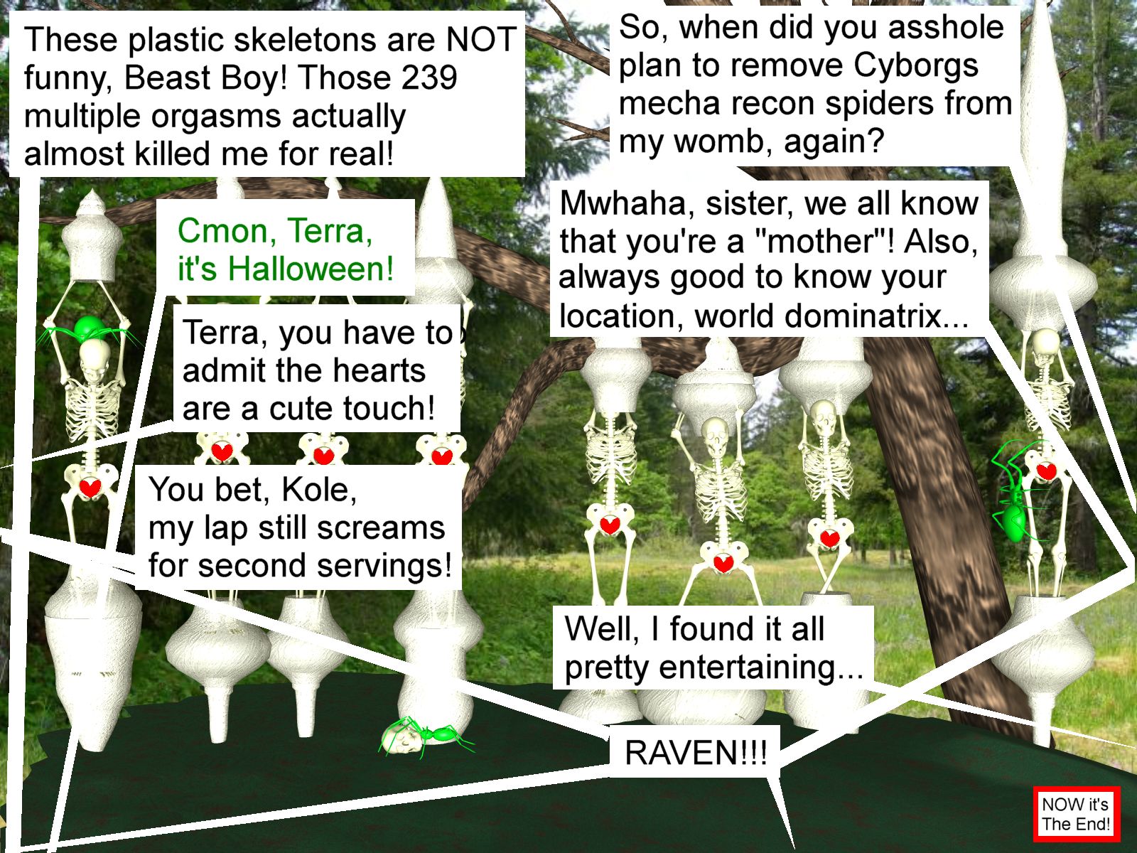 "These plastic skeletons are NOT funny, Beast Boy! Those 239 multiple orgasms actually almost killed me for real!" Terra complained, somewhat half-heartedly.